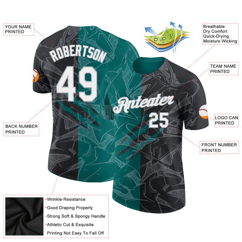 Custom Graffiti Pattern Black Teal-Gray Scratch 3D Performance T-Shirt