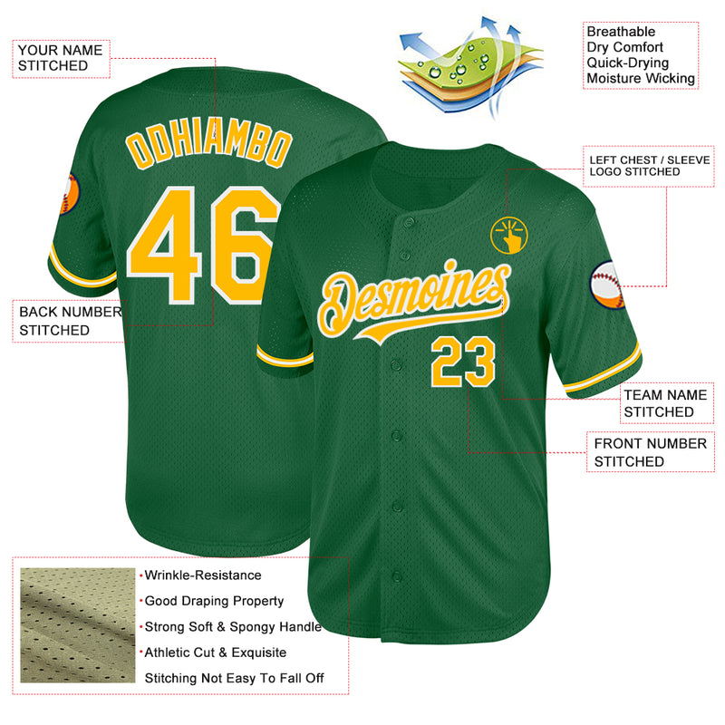 Custom Kelly Green Gold-White Mesh Authentic Throwback Baseball Jersey