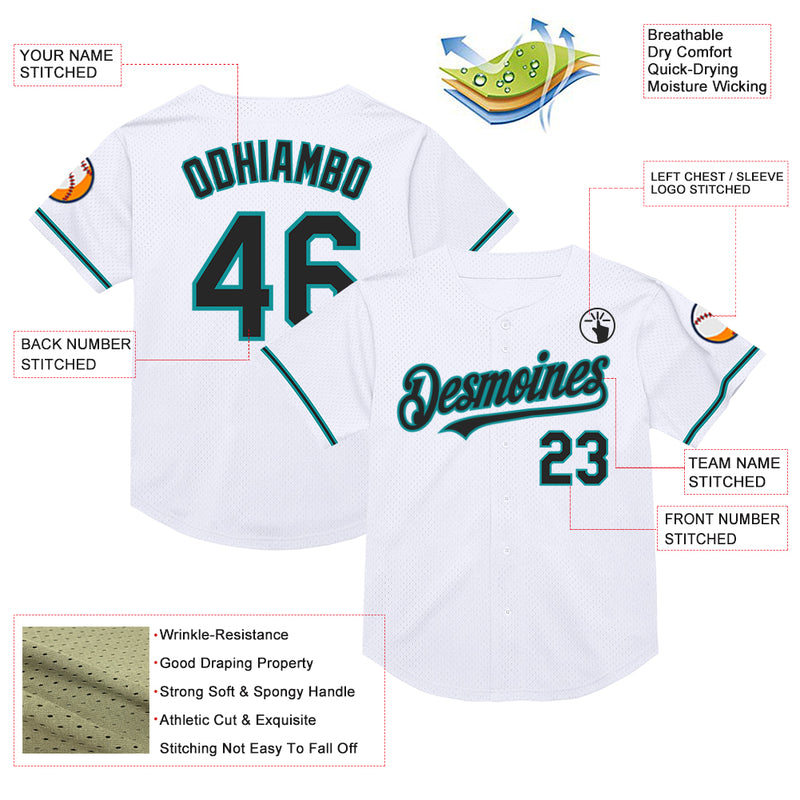 Custom White Black-Teal Mesh Authentic Throwback Baseball Jersey
