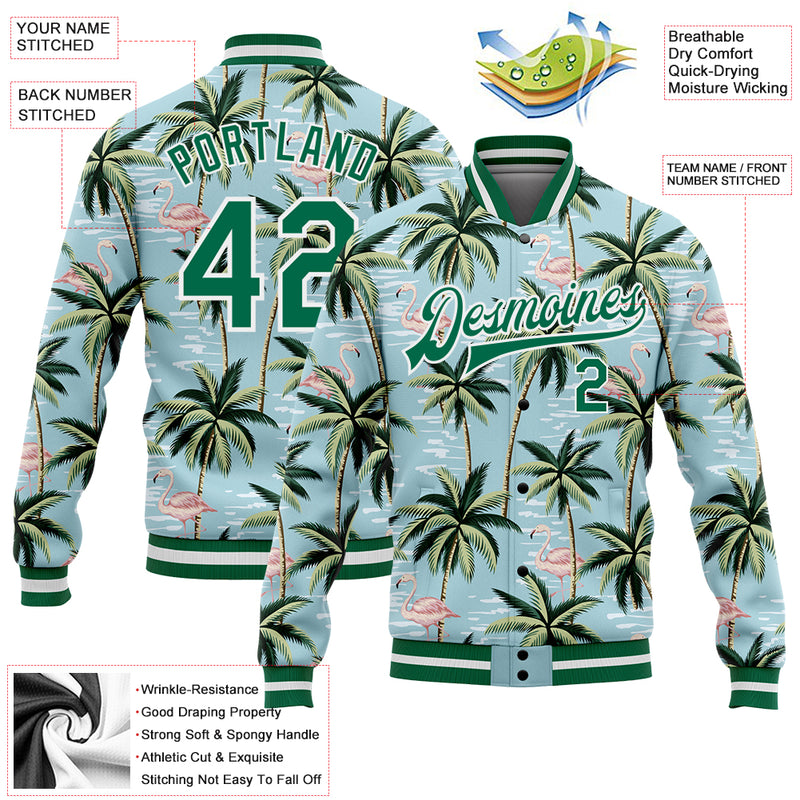 Custom Lakes Blue Kelly Green-White Flamingo And Tropical Hawaii Palm Tree 3D Bomber Full-Snap Varsity Letterman Jacket