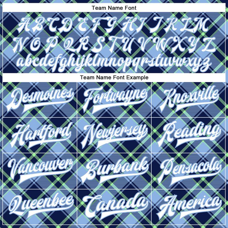 Custom Light Blue Navy-Neon Green Check Board 3D Pattern Design Bomber Full-Snap Varsity Letterman Jacket