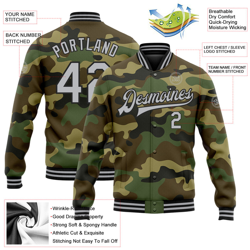 Custom Camo Gray-Black Bomber Full-Snap Varsity Letterman Salute To Service Jacket