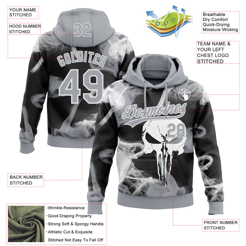 Custom Stitched Gray Black-White Skull Pattern Pullover Sweatshirt Hoodie