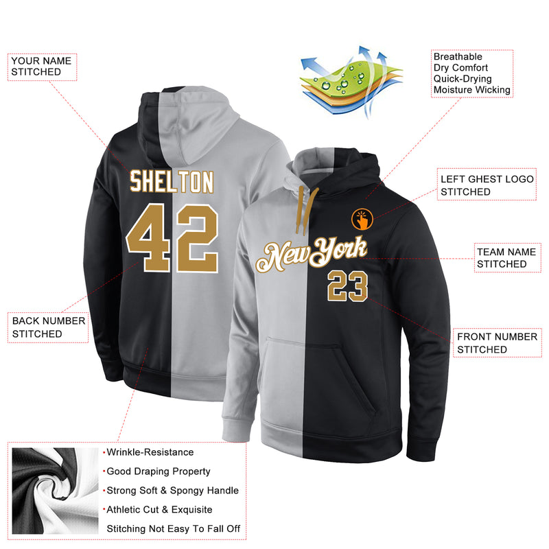 Custom Stitched Gray Old Gold-Black Split Fashion Sports Pullover Sweatshirt Hoodie