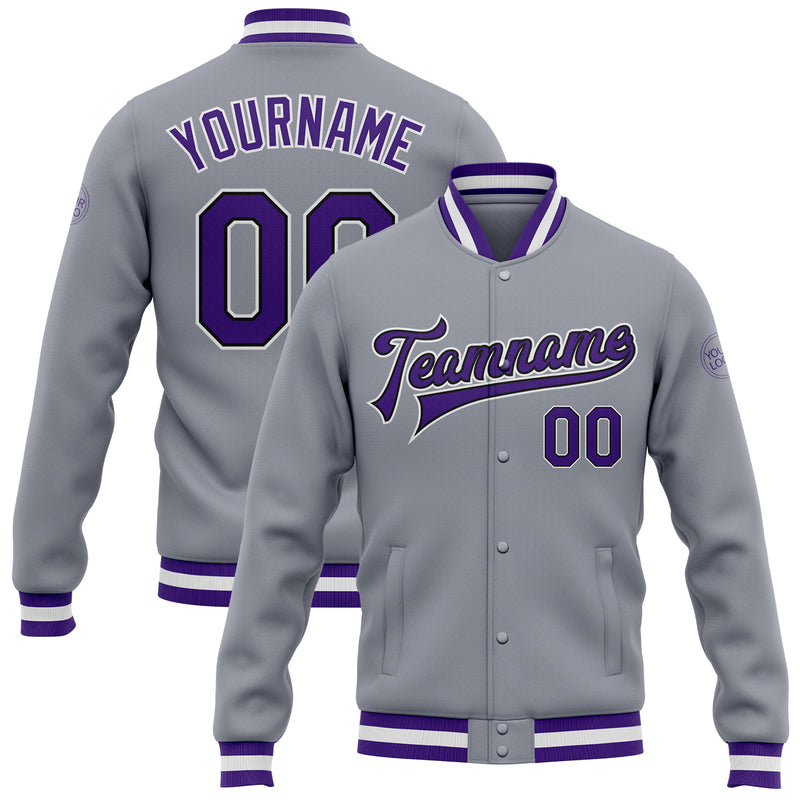 Custom Gray Purple-Black Bomber Full-Snap Varsity Letterman Jacket