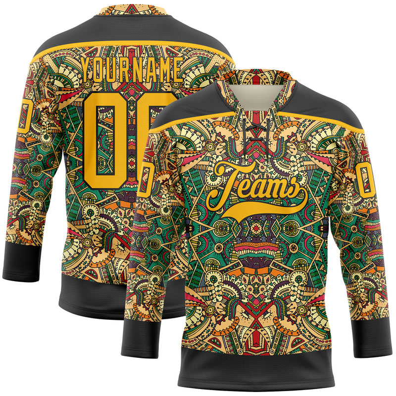 Custom Black Gold 3D Pattern Native Americans Tribal Indigenous People Hockey Lace Neck Jersey