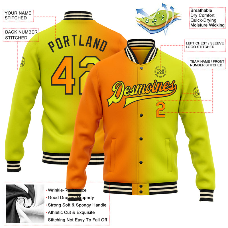 Custom Neon Yellow Bay Orange-Black Bomber Full-Snap Varsity Letterman Gradient Fashion Jacket