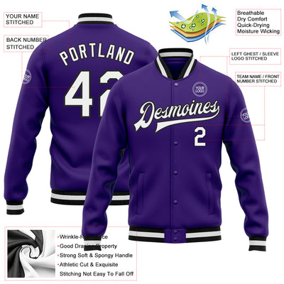 Custom Purple White-Black Bomber Full-Snap Varsity Letterman Jacket