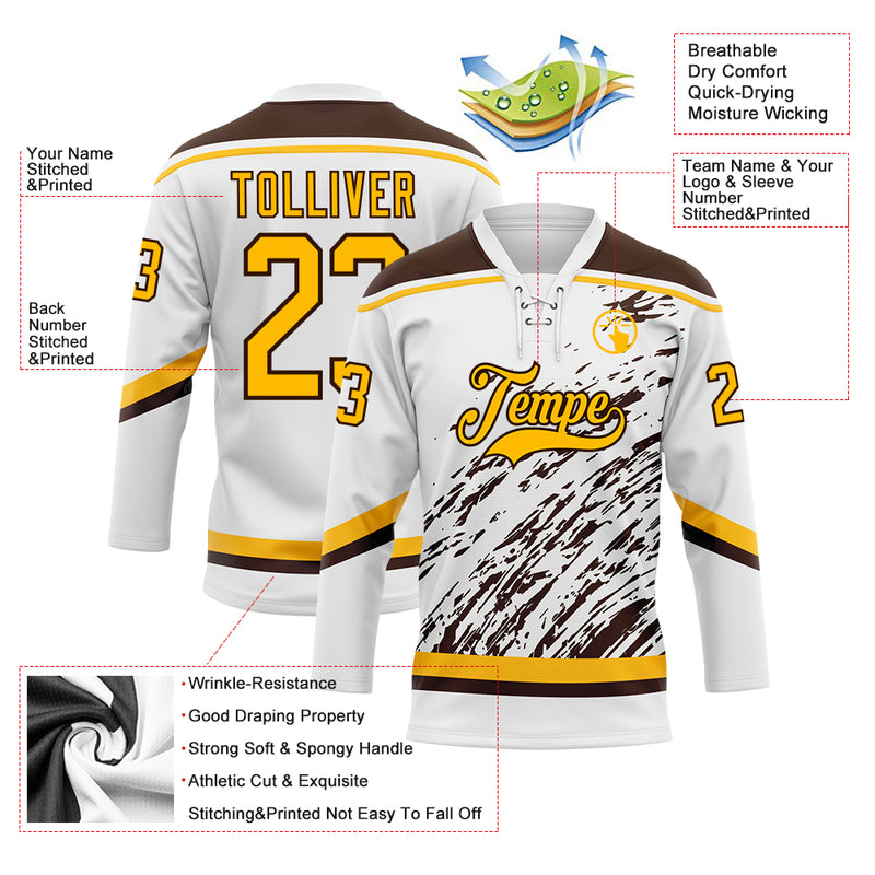 Custom White Gold-Brown 3D Splash Art Hockey Lace Neck Jersey