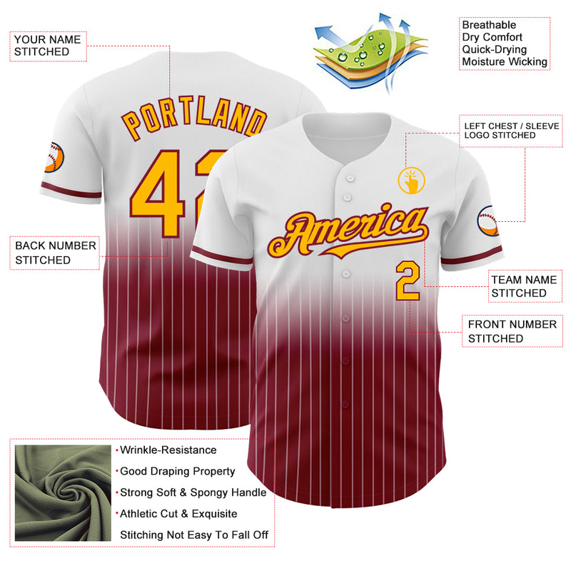 Custom White Pinstripe Gold-Crimson Authentic Fade Fashion Baseball Jersey