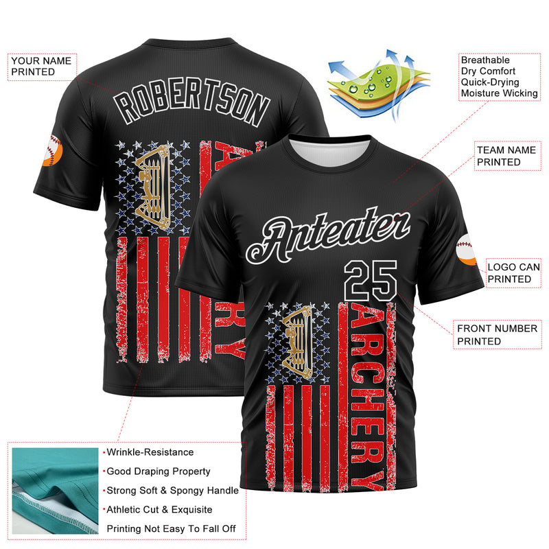 Custom Black Fire Red-White 3D Pattern Design Arrow Archery Bow Target American Flag Performance T-Shirt