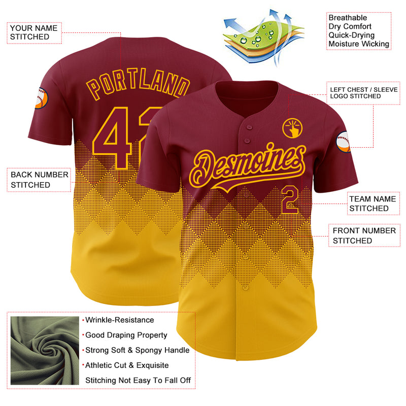 Custom Crimson Gold 3D Pattern Design Gradient Square Shapes Authentic Baseball Jersey