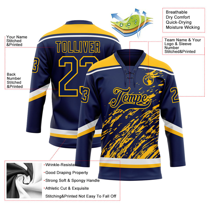 Custom Navy Gold-White 3D Splash Art Hockey Lace Neck Jersey