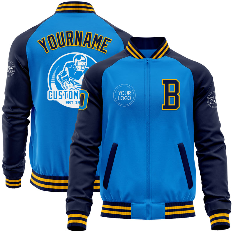 Custom Powder Blue Gold-Navy Bomber Varsity Letterman Two Tone Zipper Jacket