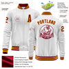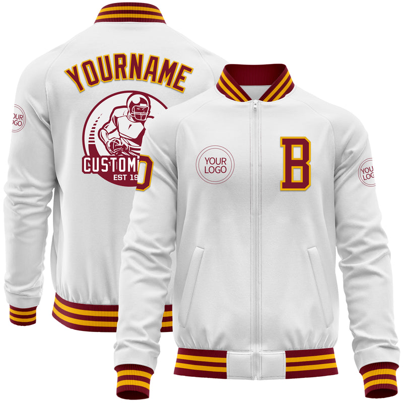 Custom White Crimson-Gold Bomber Varsity Letterman Zipper Jacket