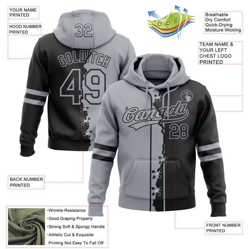 Custom Black Gray Split Ripped Pattern Baseball Pullover Sweatshirt Hoodie
