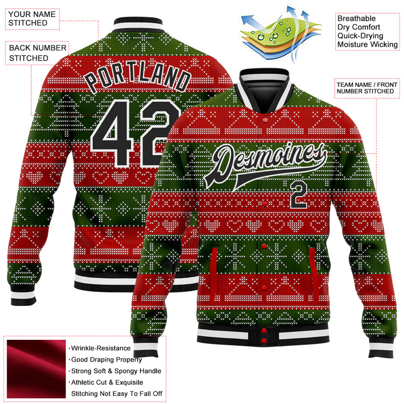 Custom Red Black-Green Christmas 3D Bomber Full-Snap Varsity Letterman Jacket