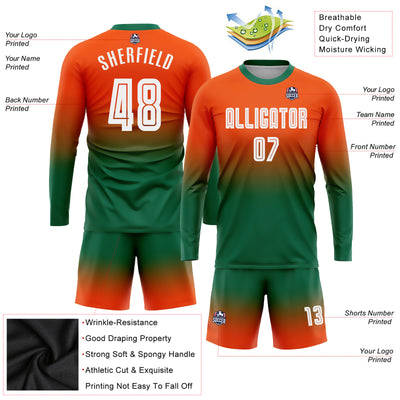 Custom Orange White-Kelly Green Sublimation Long Sleeve Fade Fashion Soccer Uniform Jersey