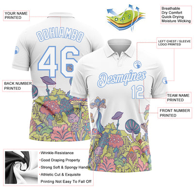 Custom White Light Blue 3D Pattern Design Colorful Flowers And Mushrooms Psychedelic Hallucination Performance Golf Polo Shirt
