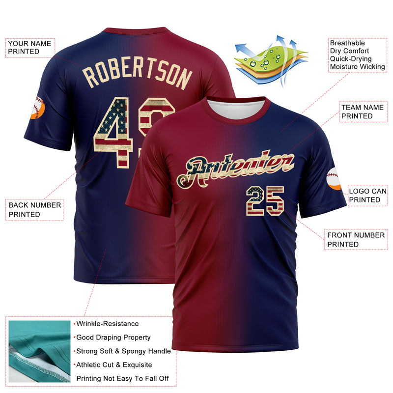 Custom Navy Vintage USA Flag Maroon-Cream Gradient Fashion Performance T-Shirt