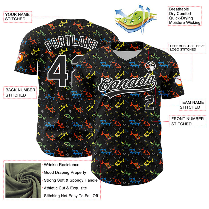 Custom Black White 3D Pattern Design Animal Fish Authentic Baseball Jersey