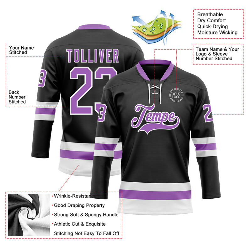 Custom Black Medium Purple-White Hockey Lace Neck Jersey