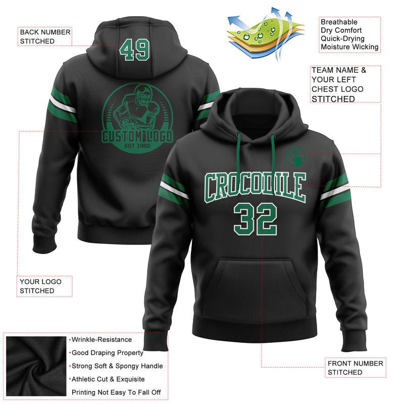 Custom Stitched Black Kelly Green-White Football Pullover Sweatshirt Hoodie