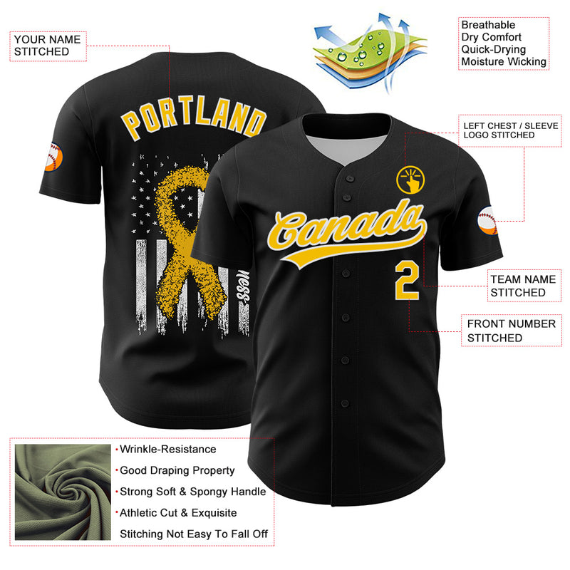Custom Black Yellow-White 3D Childhood Cancer Gold Ribbon American Flag Authentic Baseball Jersey