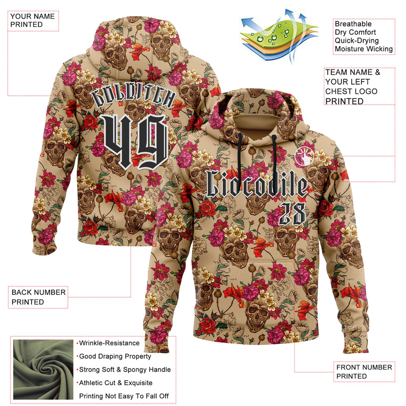 Custom Brown Black-White 3D Skull Roses Gothic Floral Vintage Sports Pullover Sweatshirt Hoodie