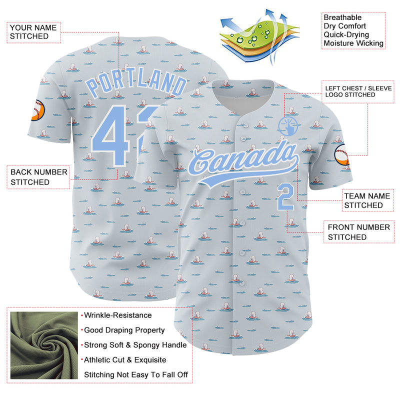 Custom Gray Light Blue-White 3D Pattern Design Animal Dog Surfing Authentic Baseball Jersey