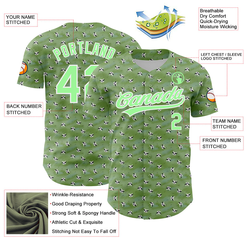 Custom Green Pea Green-White 3D Pattern Design Animal Cow Authentic Baseball Jersey