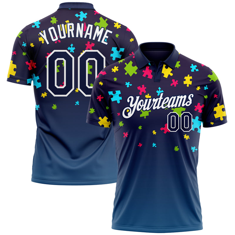 Custom Navy White 3D Pattern Design Autism Awareness Puzzle Pieces Performance Golf Polo Shirt