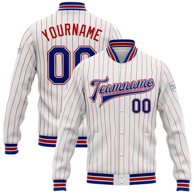 Custom White Red Pinstripe Royal Bomber Full-Snap Varsity Letterman Jacket