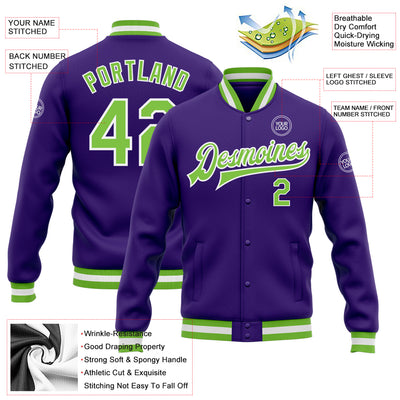 Custom Purple Neon Green-White Bomber Full-Snap Varsity Letterman Jacket