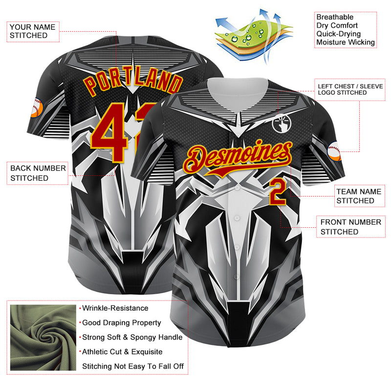 Custom Black Red-Yellow 3D Pattern Design Burner Costumes Mecha Authentic Baseball Jersey